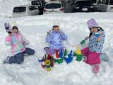 1年生は、晴れ空のもと、グラウンドで雪遊びをしました。